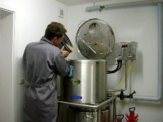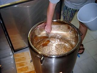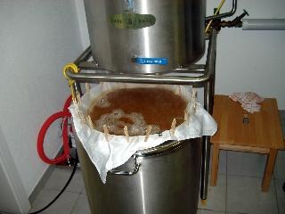 Das Würzekochen dient auch noch der Deaktivierung der Enzyme, der Sterilisierung und der Ausfällung von Eiweisstoffen. Letztere sind Hauptbestandteil des Heißtrubes und müssen wieder ausgefiltert werden. Wir machen das mit einem sehr feinen Filtergewebe. Gleichzeitig wird die nun klare "Ausschlagwürze" auf 25° C heruntergekühlt. Dazu lassen wir kalte Leitungswasser in den doppelwandigen Gärtank. Filtern und kühlen dauern etwa 2 Stunden.